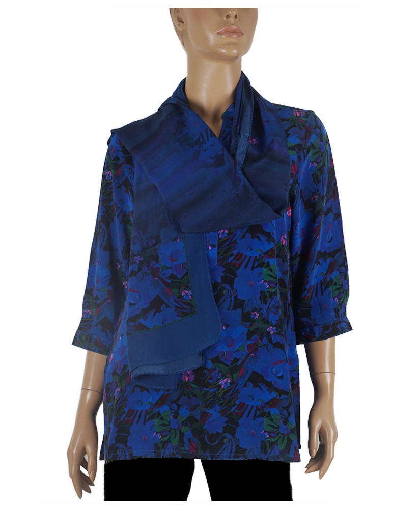 Short Silk Shirt - Deep Blue And Green Floral